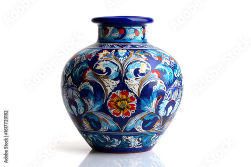 Stunning ornate blue vase with vibrant floral design creates an elegant, timeless aesthetic for interior design