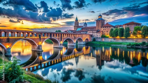 Stunning Panoramic View of Ponte Coperto Bridge Over Ticino River at Blue Hour, Pavia, Lombardy, Italy