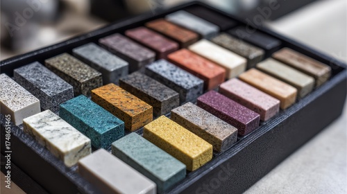 Stunning photo of various stone samples for countertops in a box, closeup shot.