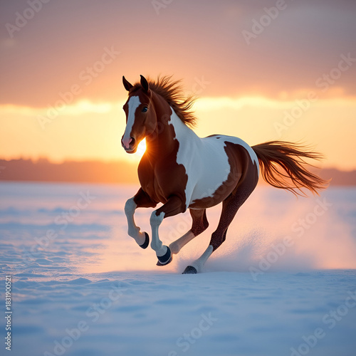 Stunning Pinto Horse Galloping Through Snowy Field at Sunset