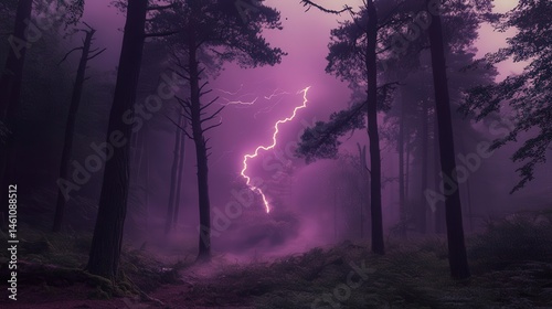 Stunning purple lightning strikes through a dark forest, creating a mystical and dramatic atmosphere in the wilderness.