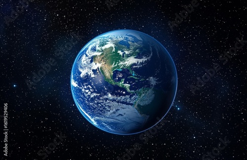 Stunning Realistic Rendering of Earth in Space with Continent Details and a Spectacular Star-Filled Background Showcasing Vastness, Depth and Earth's Fragility Amidst the Infinite