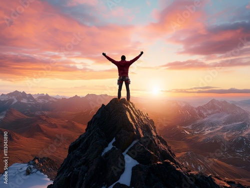 Stunning Silhouette of a Mountain Climber Reaching the Summit at Sunset with Colorful Sky and Majestic Landscape in the Background