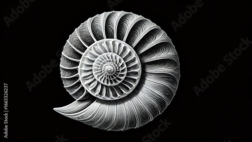 Stunning spiral seashell design against black background evokes nature's elegant geometry