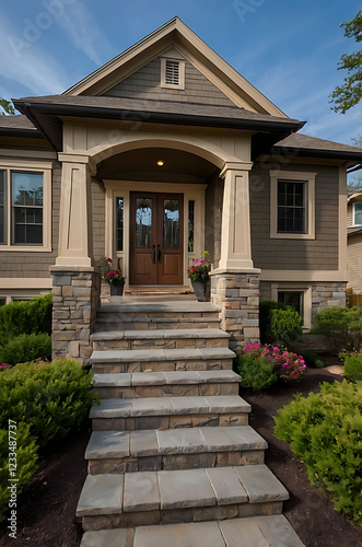 Stunning Suburban House Exterior: Modern Architecture, Stone Facade, Landscaped Garden