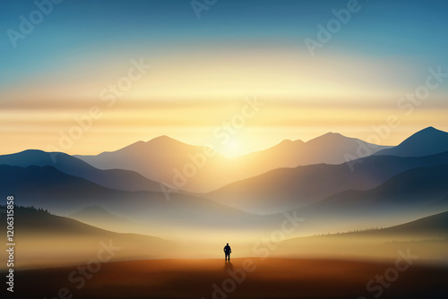 Stunning sunrise casts golden light over mountains and a solitary figure in silhouette