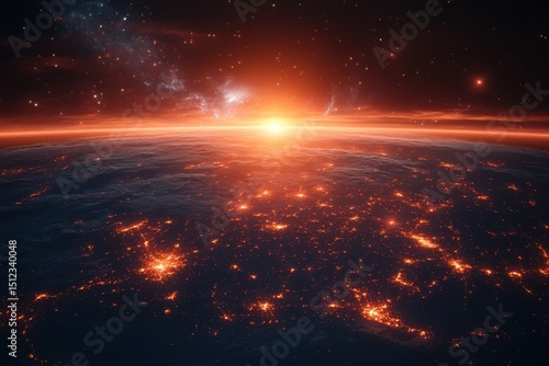 Stunning sunrise over Earth reveals glowing cities and distant galaxies in the vast cosmos