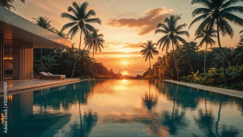Stunning sunset over an infinity pool, framed by palm trees and a modern villa.