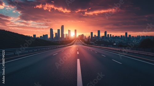 Stunning Sunset Over Modern City Skyline with Dramatic Clouds and Open Highway Leading into the Heart of Urban Landscape During Golden Hour