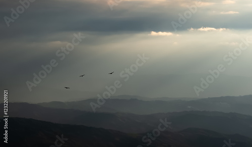 Stunning Sunset Over the Andes in Manizales, Caldas, Colombia – Vibrant Colors. Pastel mountain range. Birds flying. Soft rays of light. Clouds. Bright light.
