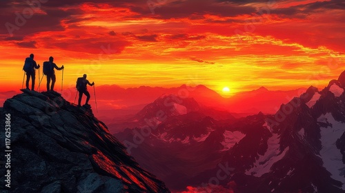 Stunning Sunset Overmountain Hikers Silhouettes in Scenic Landscape