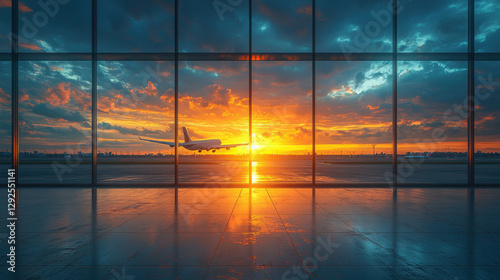 stunning sunset view of aircraft taking off behind airport window, creating dramatic atmosphere