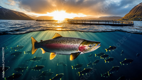 Stunning underwater view of trout swimming beneath a golden sunset over a tranquil fjord