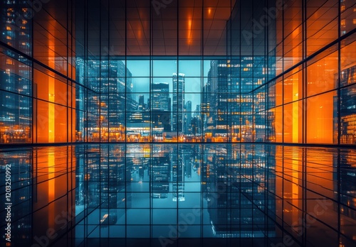 Stunning Urban Reflection, Evening Cityscape with Glass Architecture, Luminous Windows, and Modern Skyline Aglow, Capturing a Vibrant Metropolis at Dusk