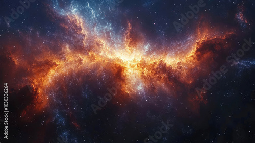 Stunning view of a fiery nebula, with rich orange and blue colors, illustrating the beauty and mystery of the universe in a deep space setting