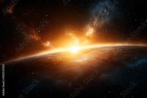 Stunning view of a sunrise over a distant planet in a vibrant cosmic landscape