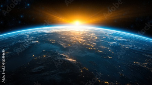 Stunning View of Earth as the Sun Rises from Space, Showcasing the Beautiful Blue Planet Surrounded by Stars and an Inspiring Glow of Sunrise over the Horizon