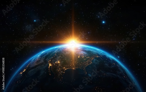 Stunning View of Earth from Space at Dawn with a Brilliant Sun Rising Over the Horizon Illuminating the Night Sky with Stars and City Lights Below