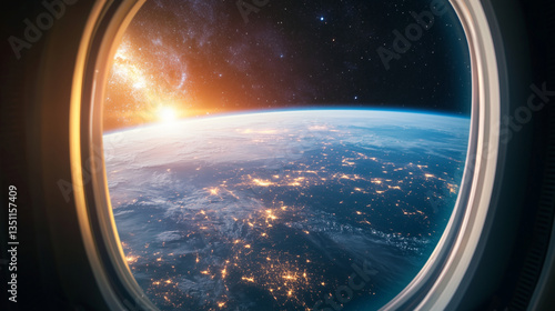 stunning view of Earth from space, showcasing illuminated continents and oceans, with bright sunrise illuminating planet.