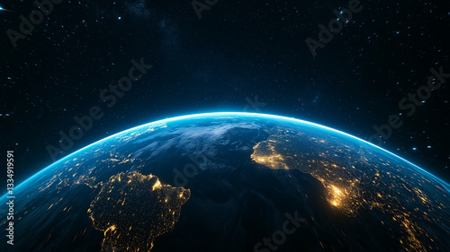 stunning view of Earth from space, showcasing illuminated continents and vibrant atmosphere. planet is surrounded by starry backdrop, emphasizing its beauty and uniqueness