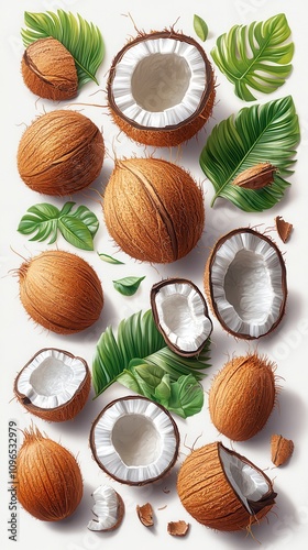 Stunning Visuals of Fresh Coconuts and Tropical Leaves. Detailed illustration of coconuts in various stages of preparation. Perfect for food blogs or product packaging.