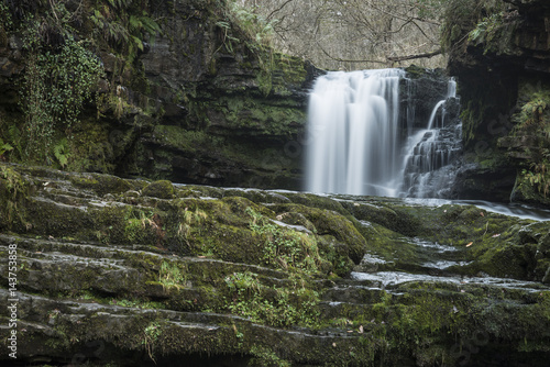 Stunning watefall landscape in cross over between Autumn and Winter with Fall colour