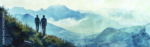 Stunning watercolor landscape of two hikers enjoying a breathtaking mountain view at dawn
