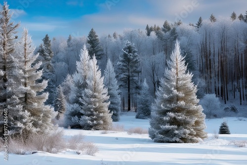 Stunning Winter Landscape with Frosted Evergreen Trees and Snow Covered Forest
