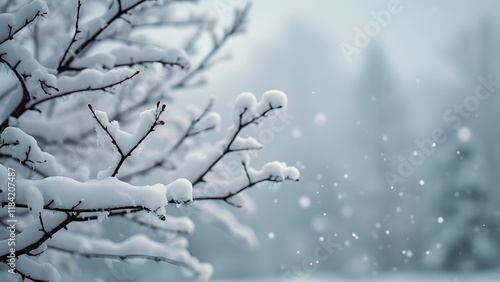 Stunning Winter Scene, Snow-Covered Branches and Falling Snowflakes Against a Clear Sky
