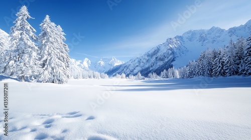 Stunning Winter Wonderland Landscape with Snow Covered Trees and Majestic Mountains in the Background : Generative AI