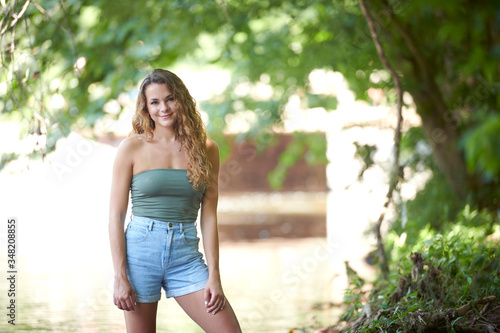 Stunning young Caucasian woman in green strapless top stands in shallow creek