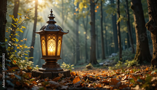 Style de trophée de célébration de leçon. Une lanterne rayonnante dans un environnement forestier paisible, baignée de douce lumière et entourée de feuilles tombantes