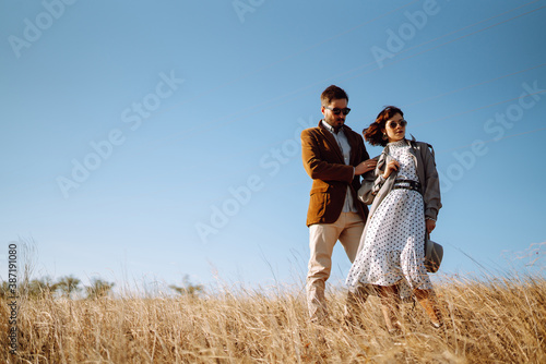 Stylish young couple enjoying autumn weather in autumn field. Lovely couple walking and hugging in the field together. The concept of youth, love and lifestyle.