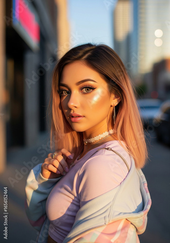 Stylish and Confident Realistic Anime Girl Posing in a Sunlit Urban