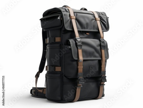 Stylish and durable black backpack with multiple compartments, leather straps, and padded back support, ideal for travel or daily use, white background