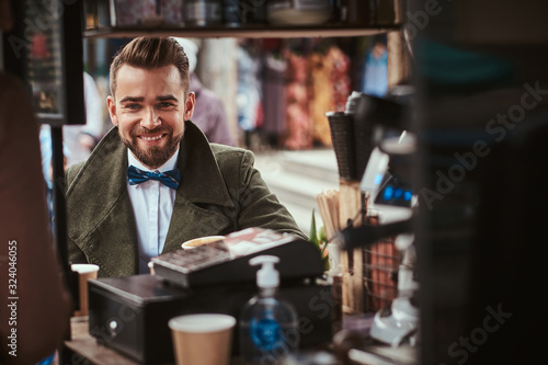 Stylish and smiling young male customer sitting outdoors next to coffee making gear in a mobile coffee shop in a city emporium, wearing green wool coat, white shirt and bow tie, holding a paper cup of