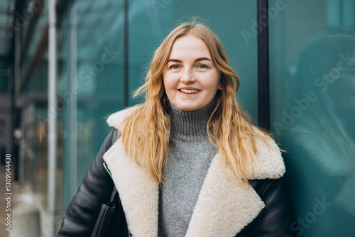 Stylish attractive young smiling 30s woman walking in modern street in winter outfit. Urban lifestyle concept. Portrait of happy woman looking at camera outdoor. High quality photo.