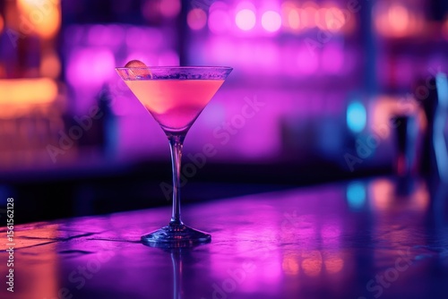 Stylish bar scene, cocktail glass in focus, purple ambiance, summer night