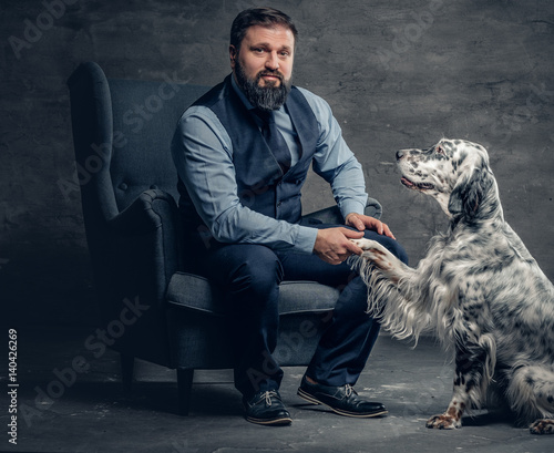 Stylish bearded male sits on a chair and the Irish setter dog.