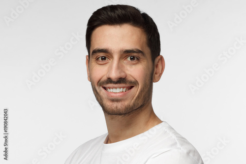Stylish bearded man smiling to camera, having pleased expression and cheerful look. Positive emotions concept.