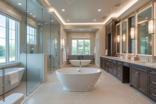 Stylish beautiful bathroom interior with glass shower and sink, window modern bathroom interior with bathroom