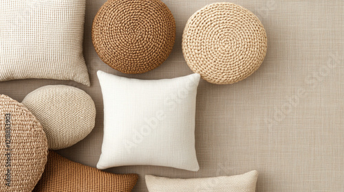 Stylish beige cushions on textured fabric create a cozy home ambiance, perfect for living room decor and comfort enhancement.