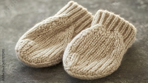 Stylish Beige Knitted Mittens: Ethically Sourced Wool for Cozy Warmth – Perfect Wall Art for Sustainable Fashion Decor or Sports Room Ambiance!