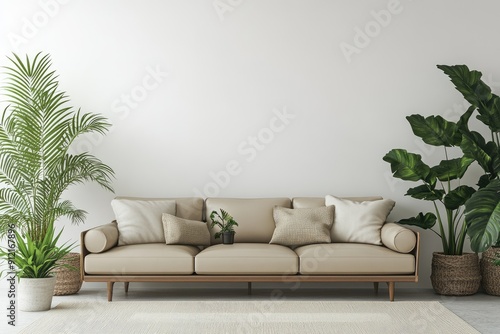 Stylish Beige Leather Sofa Accompanied by Lush Green Plants Against a Minimalist White Wall