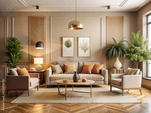 Stylish beige living room showcases framed artwork in a 3D rendering, perfect for home decor inspiration.