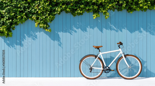 Stylish bike parked against vibrant blue wall adorned with lush green ivy, creating serene