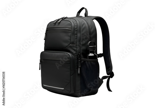 Stylish black backpack with water bottle pocket.
