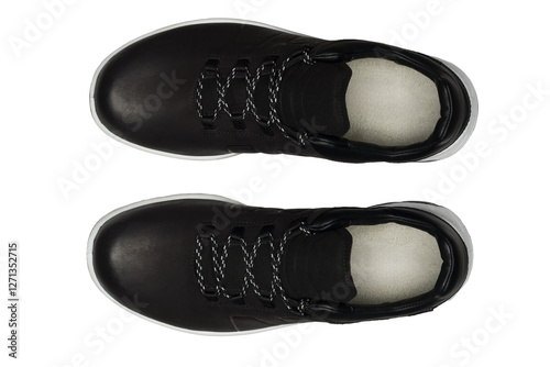 Stylish black leather sneakers with white soles and gray laces, shown from above. Isolated on transparent background