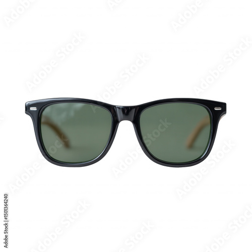 Stylish black sunglasses with green lenses on a white isolated background, perfect for fashion and accessory promotions.