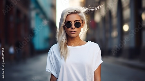 Stylish blonde girl wearing white t-shirt and glasses